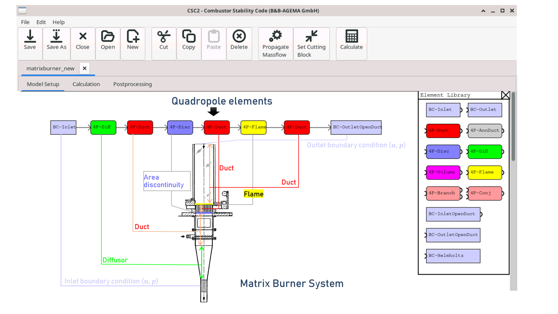A network model of an acoustic system can be created with CSC by dragging quadropole blocks from the thermoacoustic element library into a new model window. This is part of the “Model Setup” tab, where individual blocks can be arranged and connected by linking their inports and outports. The library of acoustic models provides quadropole blocks for the basic elements needed to model a gas turbine combustion system.