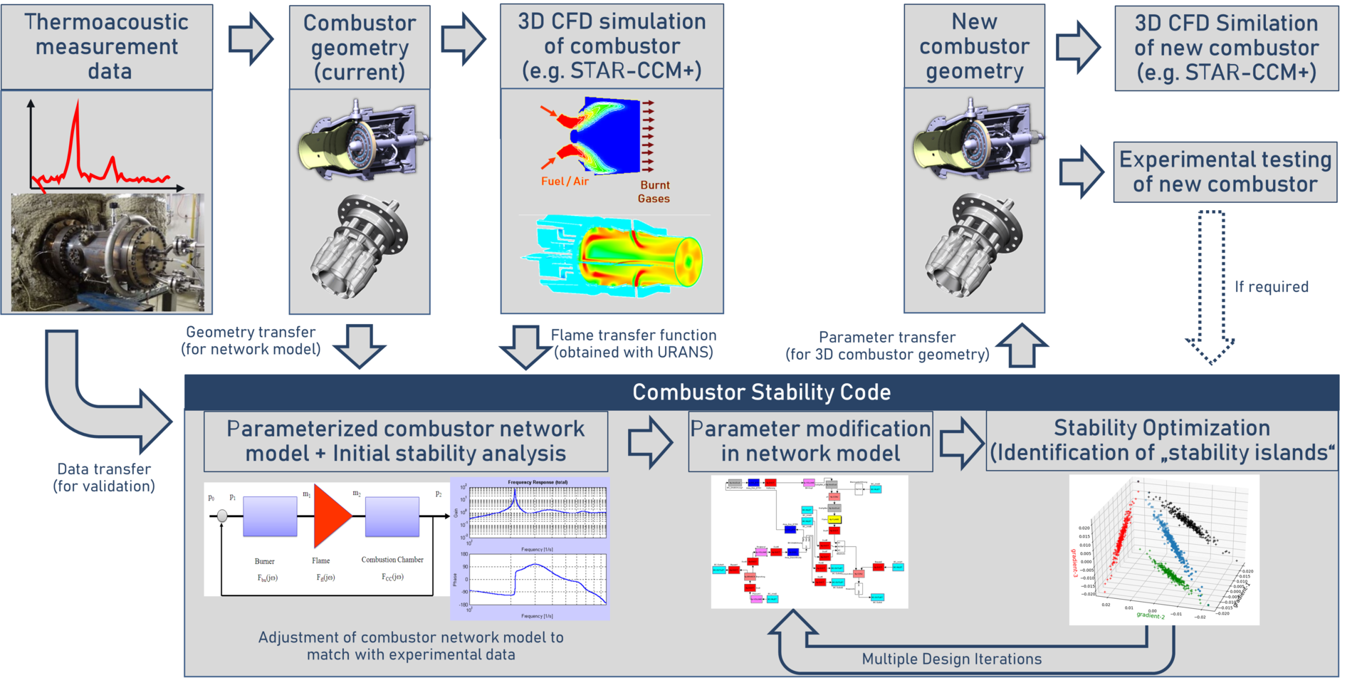 Based on real combustor geometry, the software constructs a network model consisting of multiple acoustic elements. The properties of these elements are parameterized, allowing for further adjustments based on measurement data. Acting as the source of unsteady heat release, the flame serves as one element in the acoustic network. Its transfer function can be approximated using analytical models or, more accurately, obtained from experimental data or numerical analysis and directly imported into the software. Thanks to the parameterized feature, geometric modifications can be easily incorporated into the CSC network model.