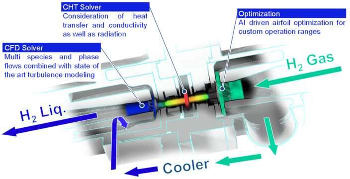 The future hydrogen world offers a new variety of applications, process cycles and challenges for essential devices like turbo pumps, compressors and liquefier. A sustainable hydrogen infrastructure needs reliable turbo components to safely store and transport the hydrogen. A core competence of B&B-AGEMA is the aero thermal design of these important devices. We excel in providing designs from the scratch as well as upgrades. With our AI driven design approach we are able to support our clients with custom and efficient solutions.